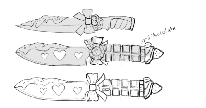 - The first week was dedicated to drawing the melee concept. From Tuesday-Thursday, I focused on creating silhouettes and rough sketches. I played around with sharper shape language, and softer shape language. I messed around with different accessories that can be placed on the knife. Then on Friday I picked out and finalized the top 2 concepts I liked. The bottom two are the knife concepts I like the most.