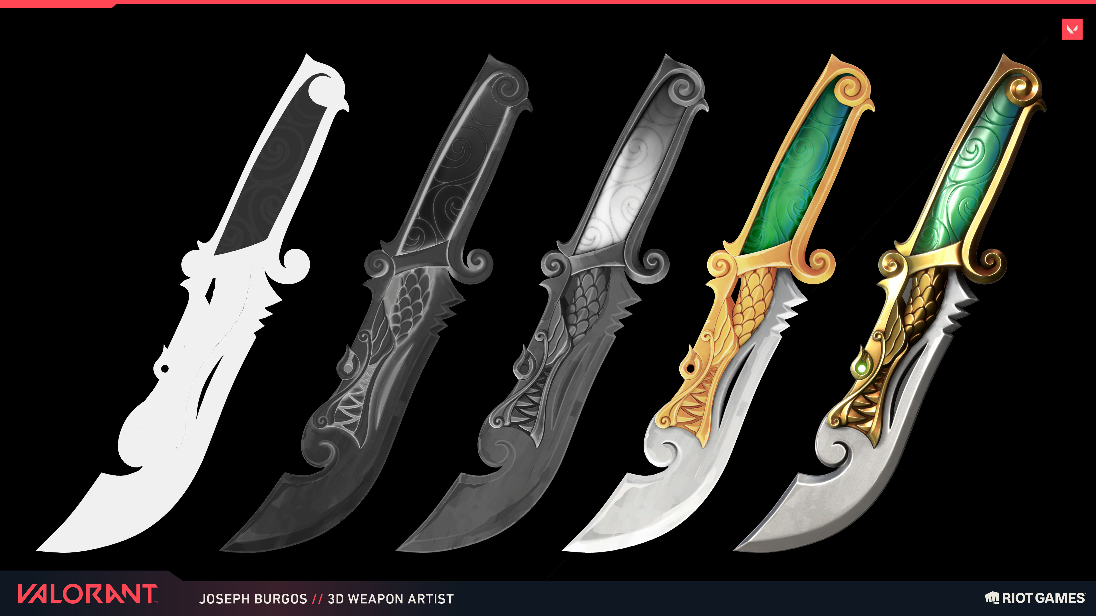 Valorant uses the hand-painted style for their texture it seems and so I want to recreate that in my own pieces. I also recognized that even in just their base colour, they colour it as if it's a shaded piece, for ex, the base colour in the knife above doesn't just straight up use one shade of yellow in the handle, it uses different shades of yellow to add dimension. The edges also tend to be a bit lighter, and in their colour variation, they seem to have brush-like textures. Studying and knowing this, I wanted to try it out in my own models.