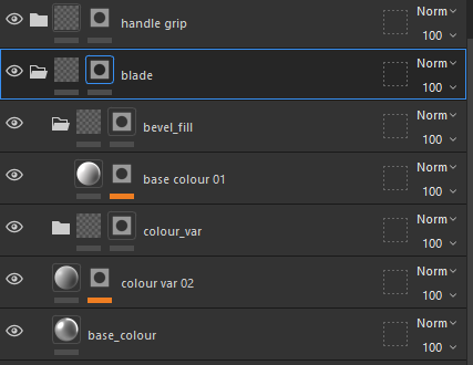 The colour variation is the folder where I put a fill layer with colours that are darker/lighter than the base colour, and I add a mask texture that looks like brush strokes. I created this texture in Photoshop by just painting a bunch of brush strokes, ad then to make sure it tiles, offset the photo, then I go over the harsh lines with the healing brush and then offset it back to the regular position.
